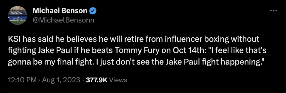 Der Grund: Fury hat Paul besiegt. Wenn KSI also gewinnen sollte, hat er den Bezwinger von Jake Paul geschlagen und braucht keinen Kampf mehr gegen ihn selbst.