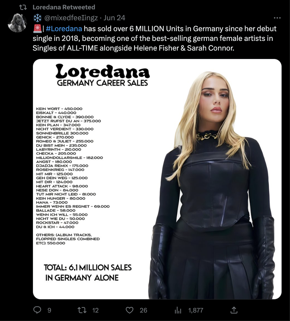 Auf Twitter wurden Loris Zahlen geleakt: Insgesamt hat die Platz 1 Künstlerin 6,1 Millionen Einheiten verkauft.