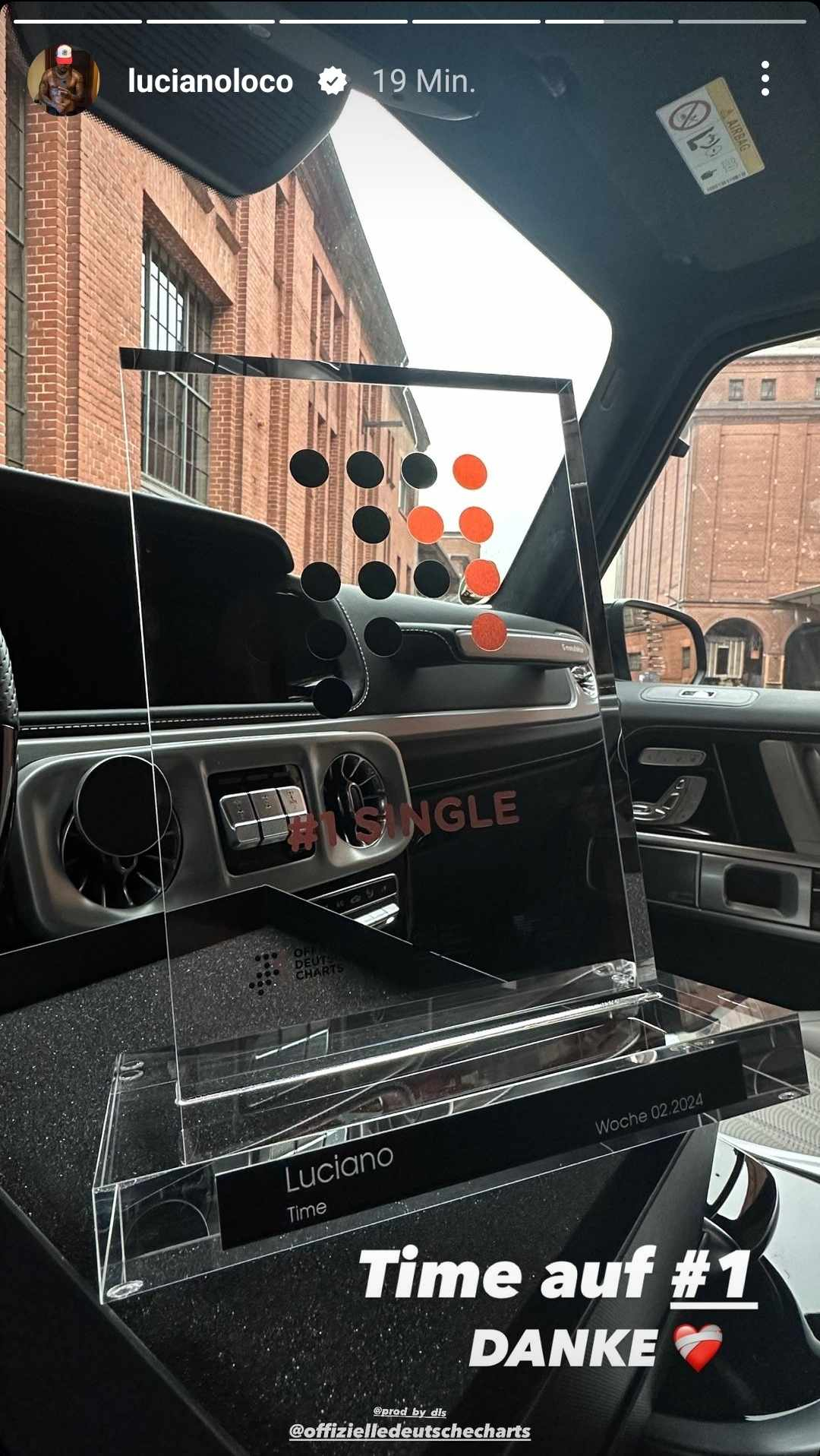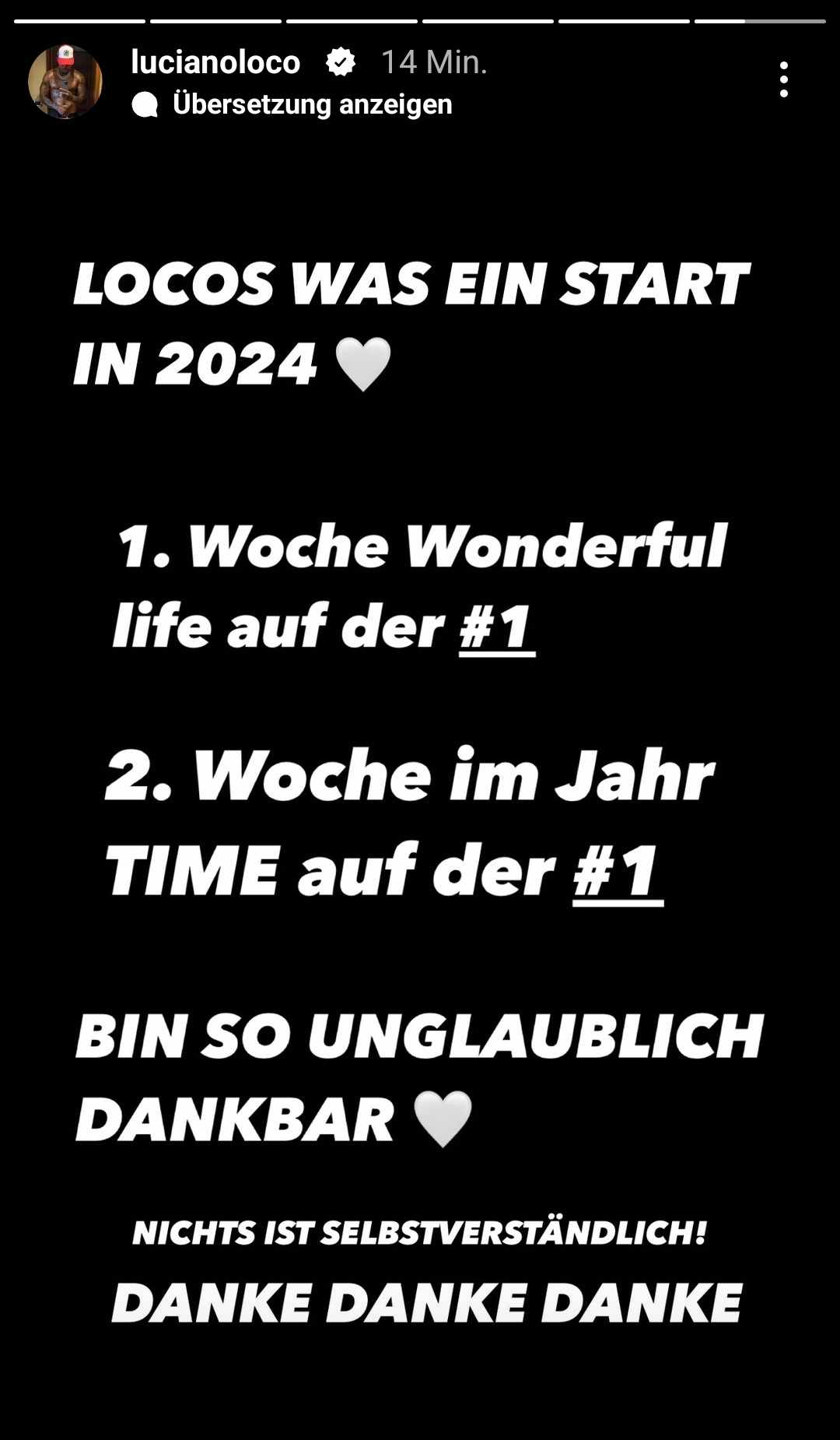 „Locos, was ein Start in 2024. 1. Woche ‚Wonderful life‘ auf der #1. 2. Woche im Jahr ‚Time‘ auf der #1. Bin so unglaublich dankar. Nichts ist selbstverständlich. Danke, danke, danke“