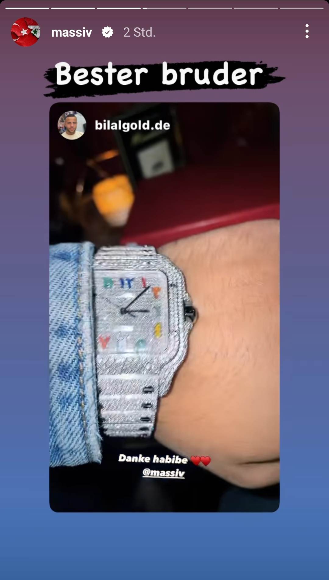 In seiner Instagram-Story zeigt der TikToker, dass der deutsche Rapper ihm eine iced-out Cartier Santos mit arabischen Ziffern geschenkt hat.