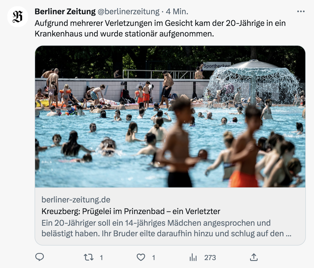 Es passiert am Sonntag Nachmittag im Prinzenbad in Berlin-Kreuzberg. Plötzlich bricht eine wilde Schlägerei aus, ein Mann muss danach ins Krankenhaus!