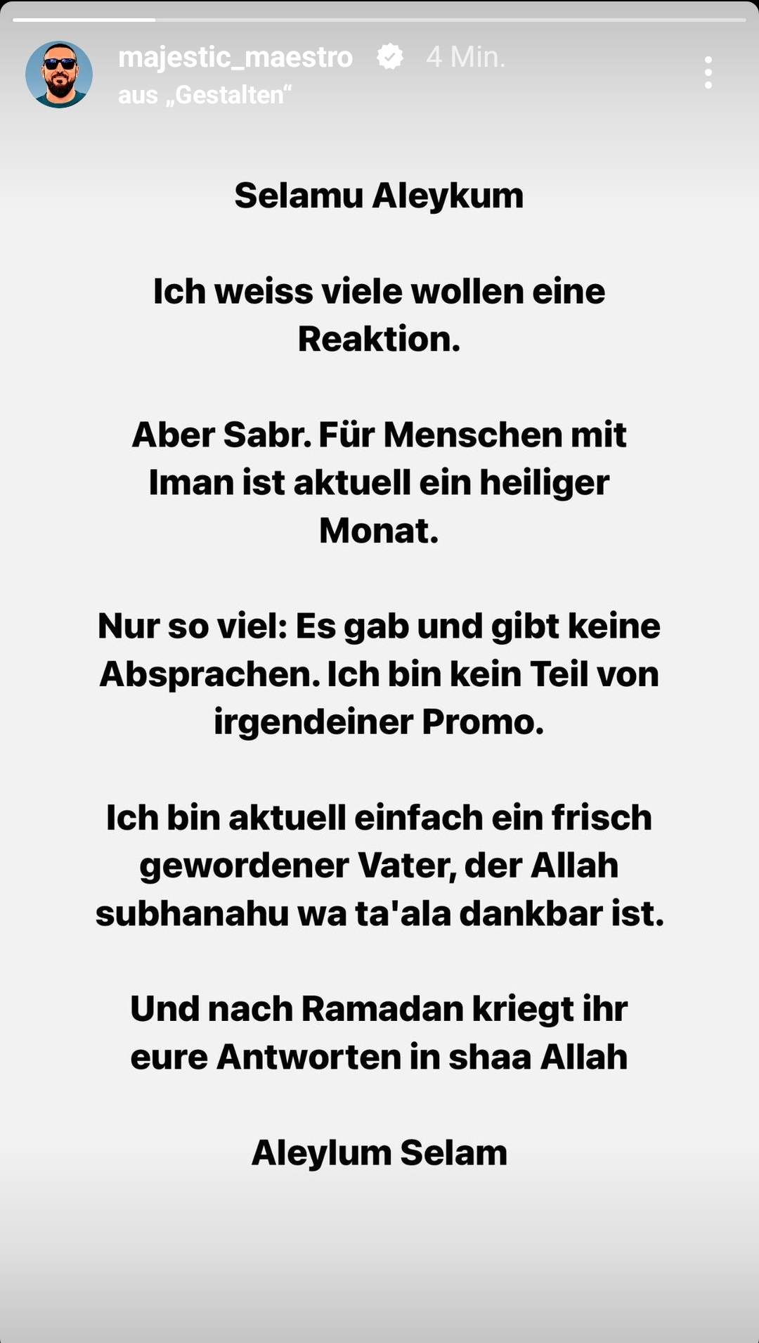 „Ich weiß viele wollen eine Reaktion, aber Geduld. Für Menschen mit Iman ist aktuell ein heiliger Monat. Nur so viel: Es gab und keine Absprachen.