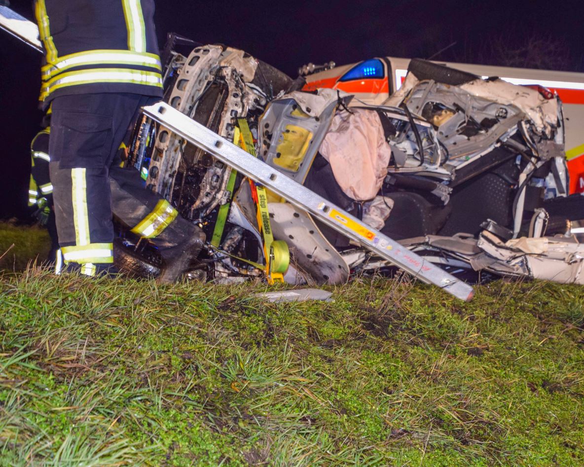 Der Unfallfahrer stirbt sofort in seinem Auto, beide Insassen des Rettungswagen überleben mit schweren Verletzungen.