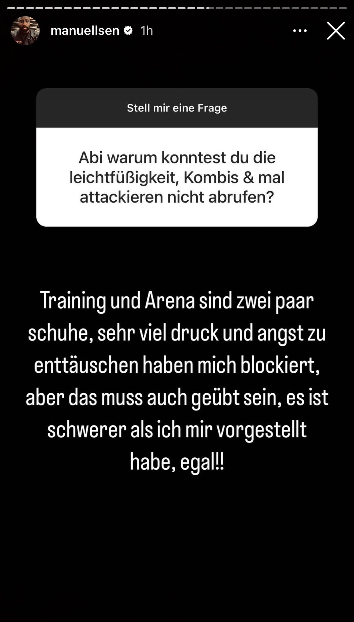 „Training und Arena sind zwei paar Schuhe, sehr viel Druck und Angst zu enttäuschen haben mich blockiert, aber das muss geübt sein, es ist schwerer als ich es mir vorgestellt habe, egal“