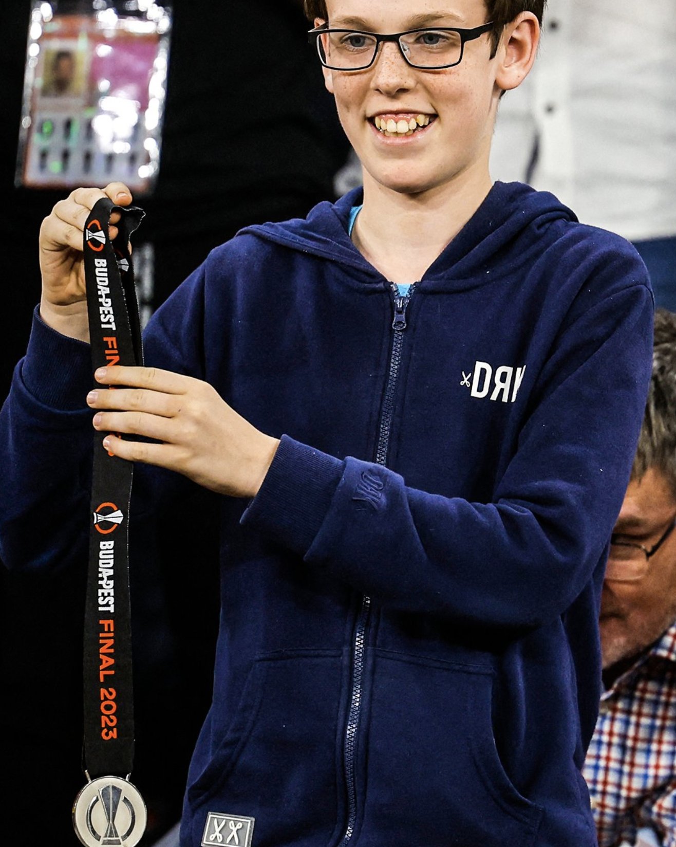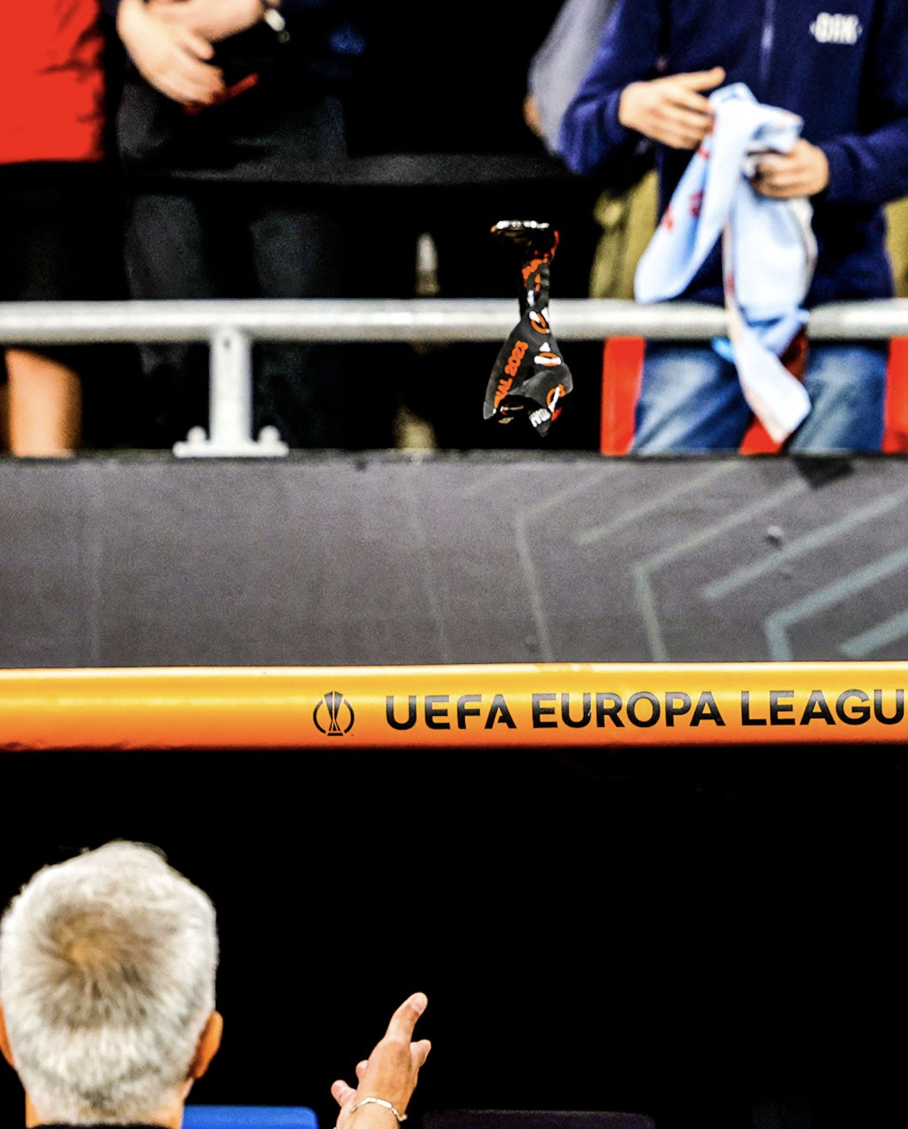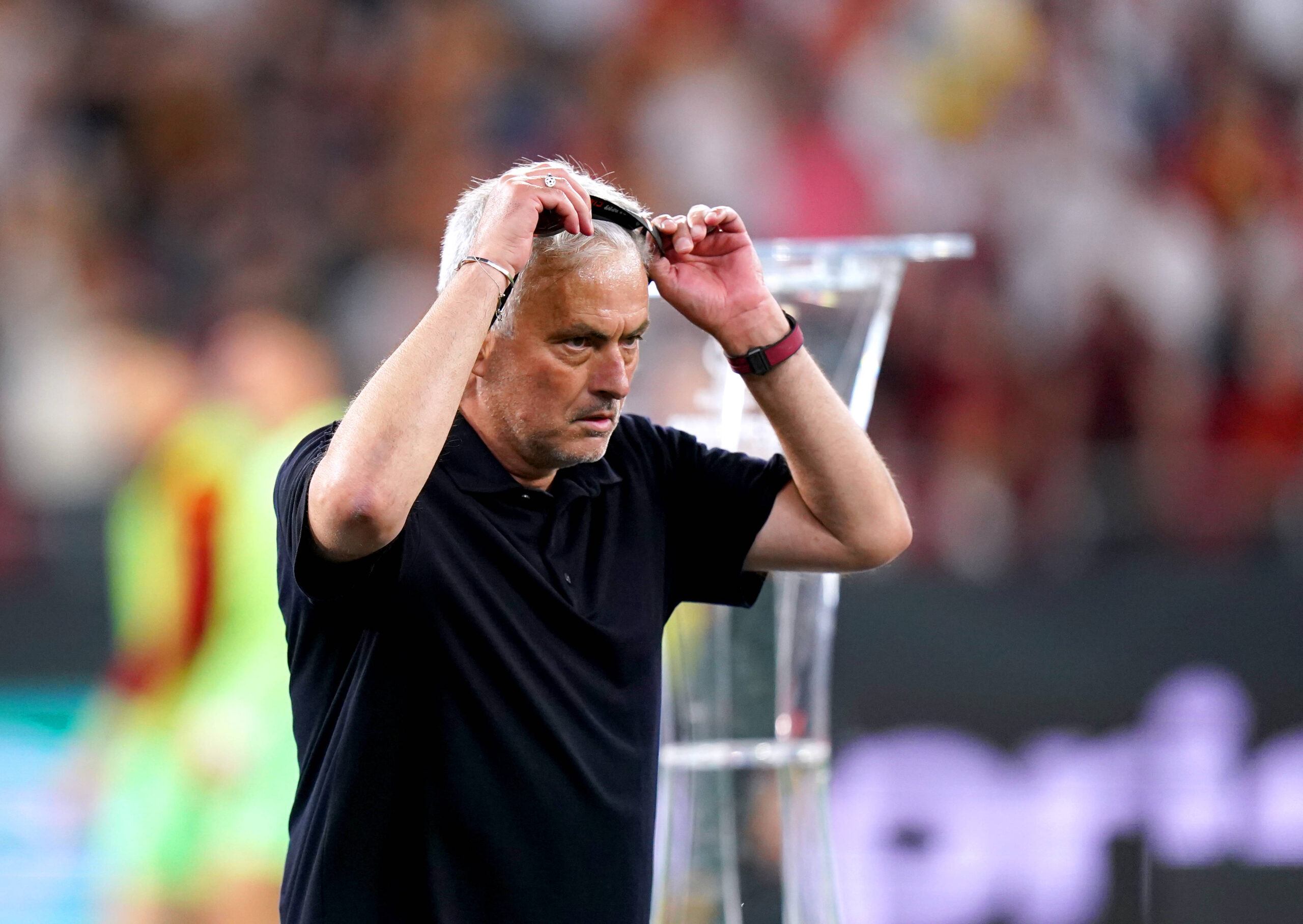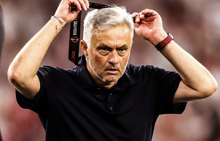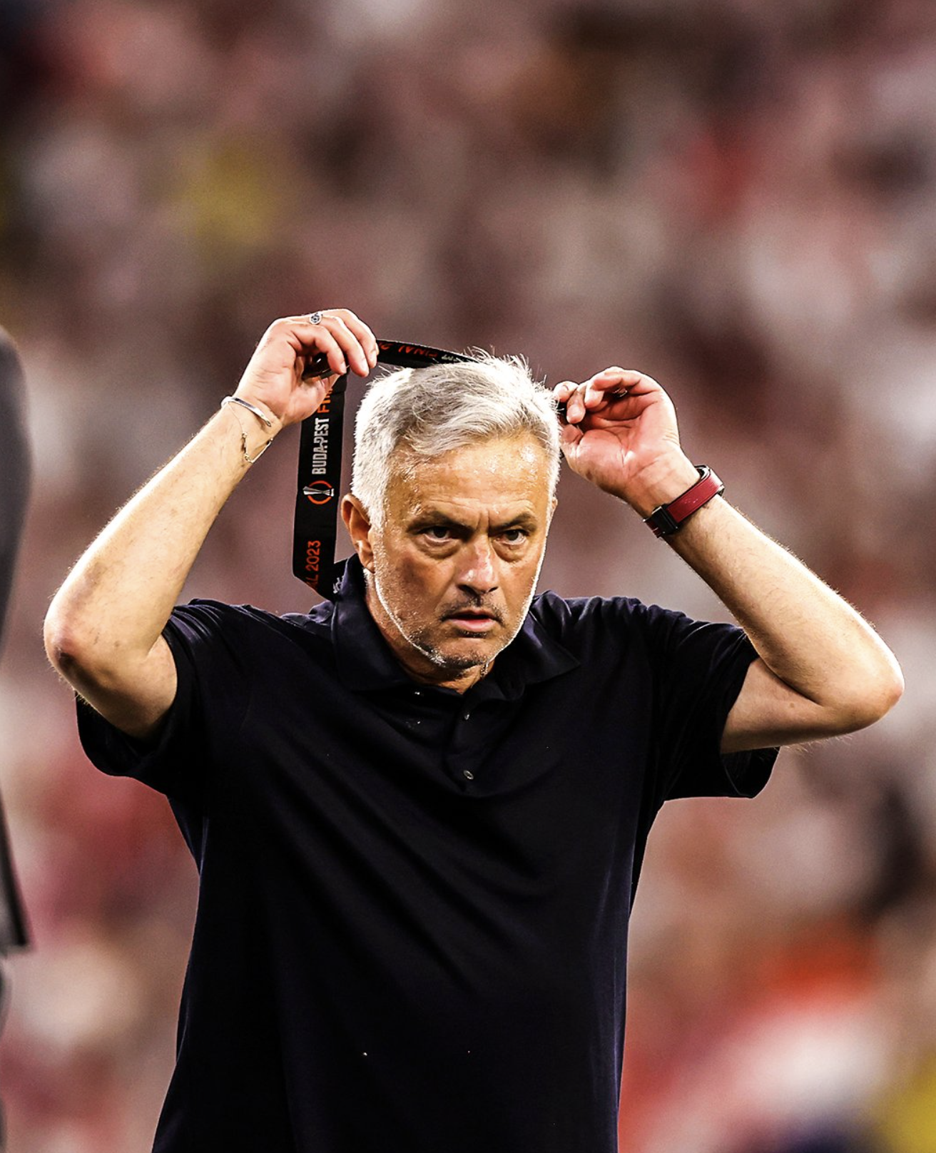 Kurz nachdem Rom-Trainer Jose Mourinho seine „Verlierer-Medaille“ erhält, nimmt er diese ab.