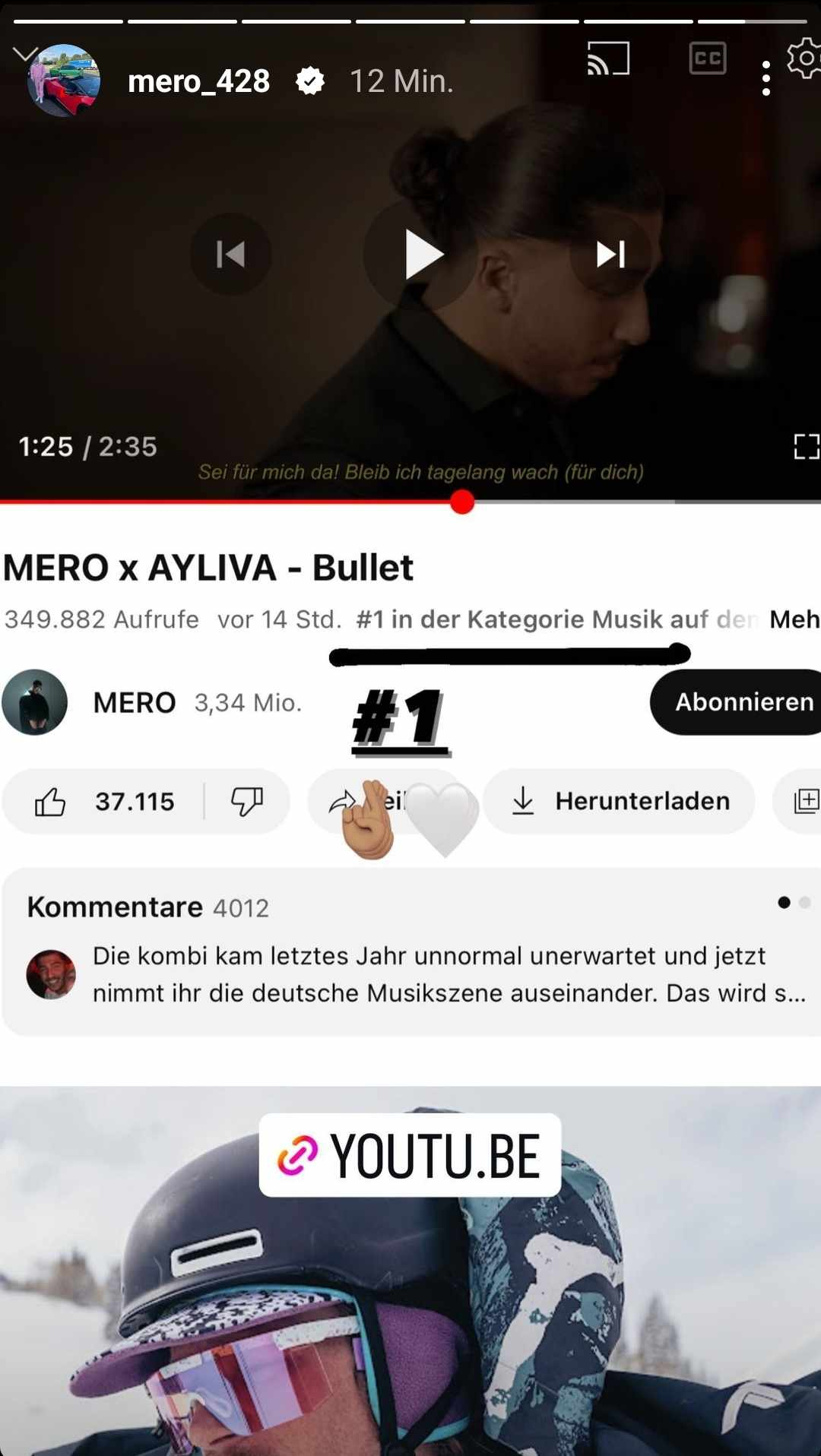 In seiner Instagram-Story präsentiert Mero am Freitag Nachittag, dass das Video zu dem neuen Track „Bullet“ bereits nach 14 Stunden weit über 300.000 Klicks hat und die Nummer 1 in der Kategorie Musik auf YouTube ist.