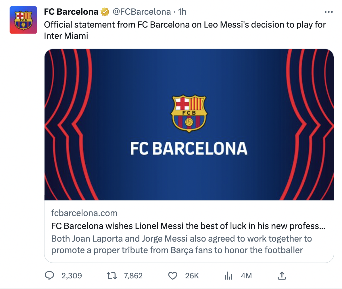 „Am Montag, dem 5. Juni, informierte Messis Vater Jorge den Clubpräsident Joan Laporta über die Entscheidung des Spielers, zu Inter Miami zu wechseln, obwohl ihm ein konkreter Vorschlag von Barça vorgelegt worden war, mit dem man den Wunsch berücksichtigte, dass er wieder Blaugrana trägt“