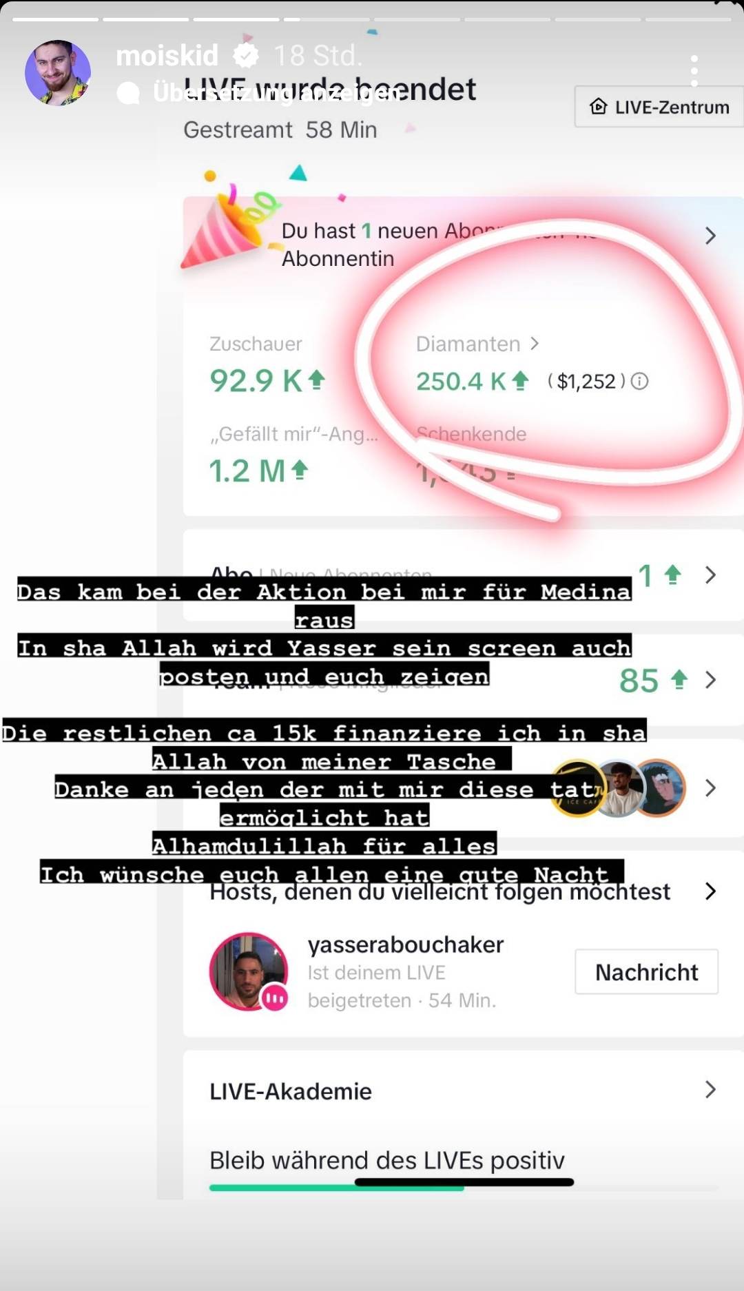 In seiner Instagram-Story zeigt Mois, dass er in einem Livestream mit Yasser Abou-Chaker mal eben 1252 Dollar (1146,71 Euro) gemacht hat.