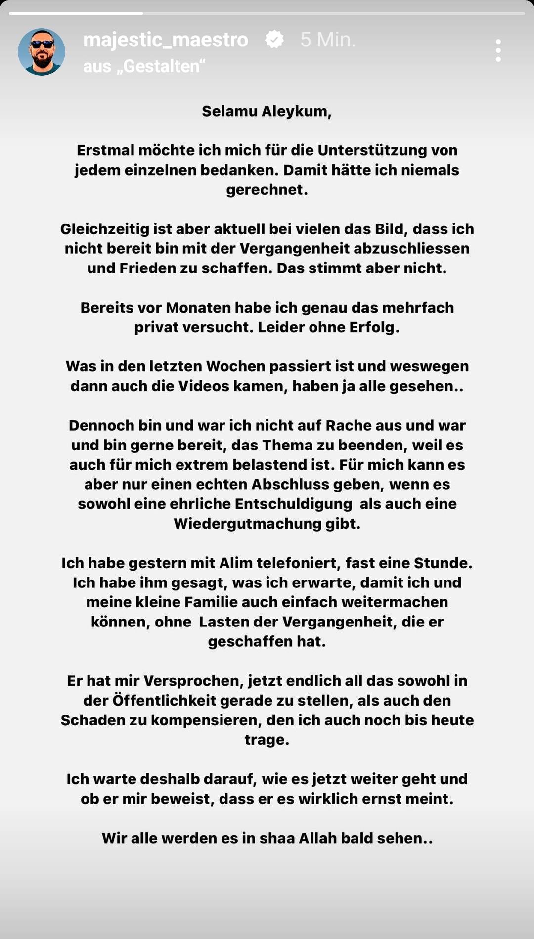 Er hat mir Versprochen, jetzt endlich all das sowohl in der Öffentlichkeit gerade zu stellen, als auch den Schaden zu kompensieren, den ich auch noch bis heute trage. Ich warte deshalb darauf, wie es jetzt weiter geht und ob er mir beweist, dass er es wirklich ernst meint. Wir alle werden es in shaa Allah bald sehen“
