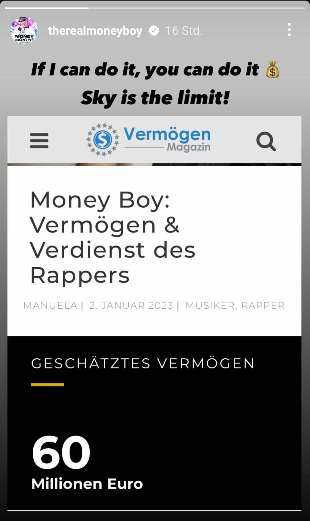 Ja, Ihr lest richtig: In seiner Instagram-Story teilt Money Boy die Schätzung seines Reichtums vom Vermögen Magazin.