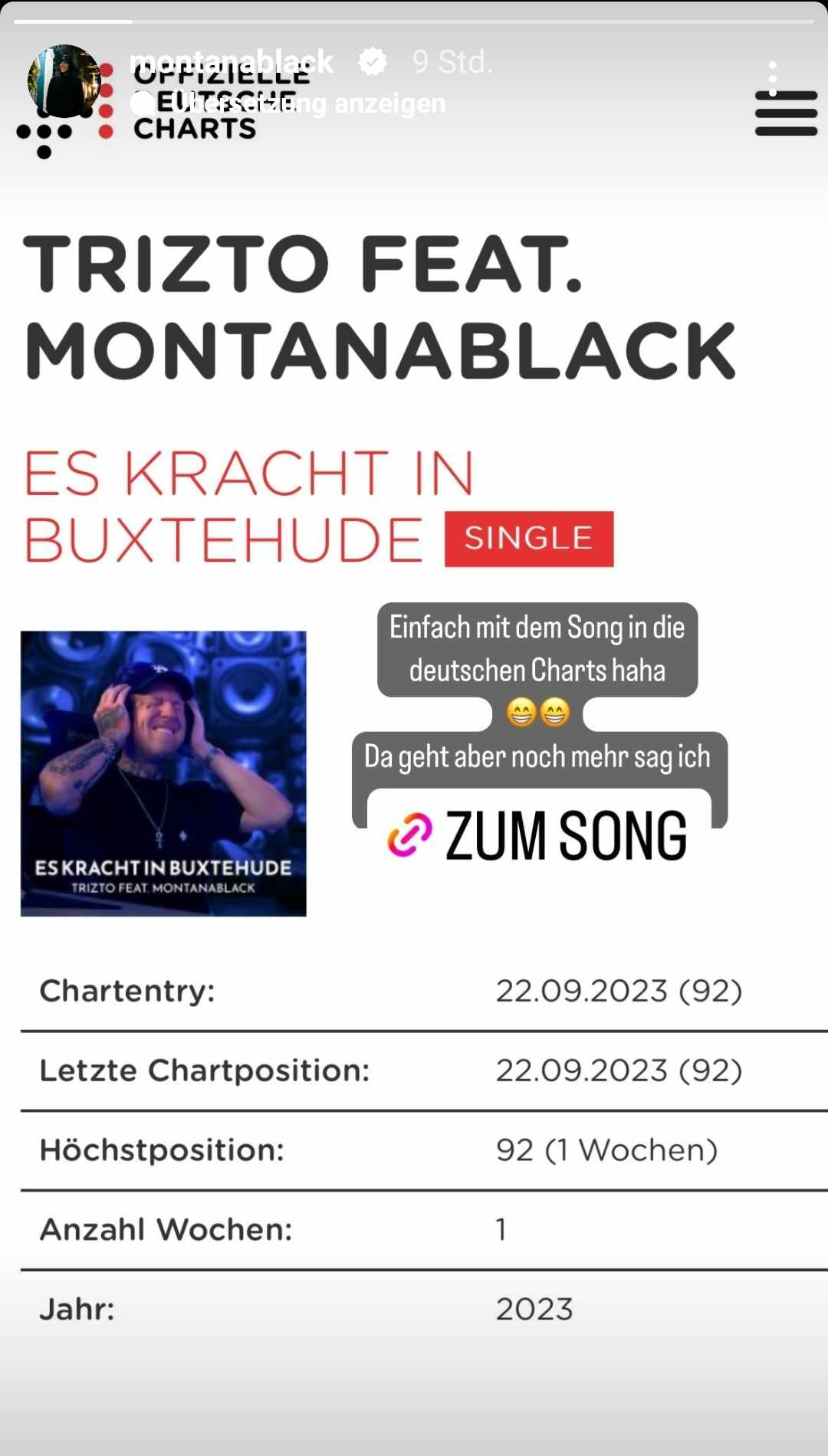 In seiner Instagram-Story zeigt Monte stolz, dass der Song „Es kracht in Buxtehude“ auf Platz 92 der offiziellen deutschen Single-Charts eingestiegen ist.