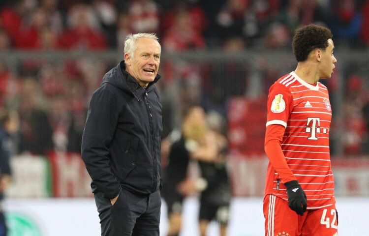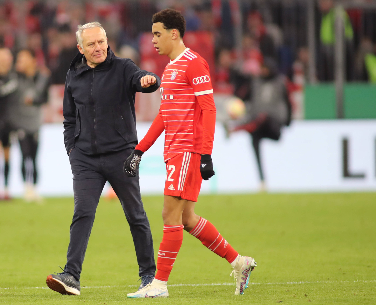 Verständlich, dass der 20-Jährige total am Boden ist. Daher geht Christian Streich zum Bayern-Angreifer und möchte ihn trösten.