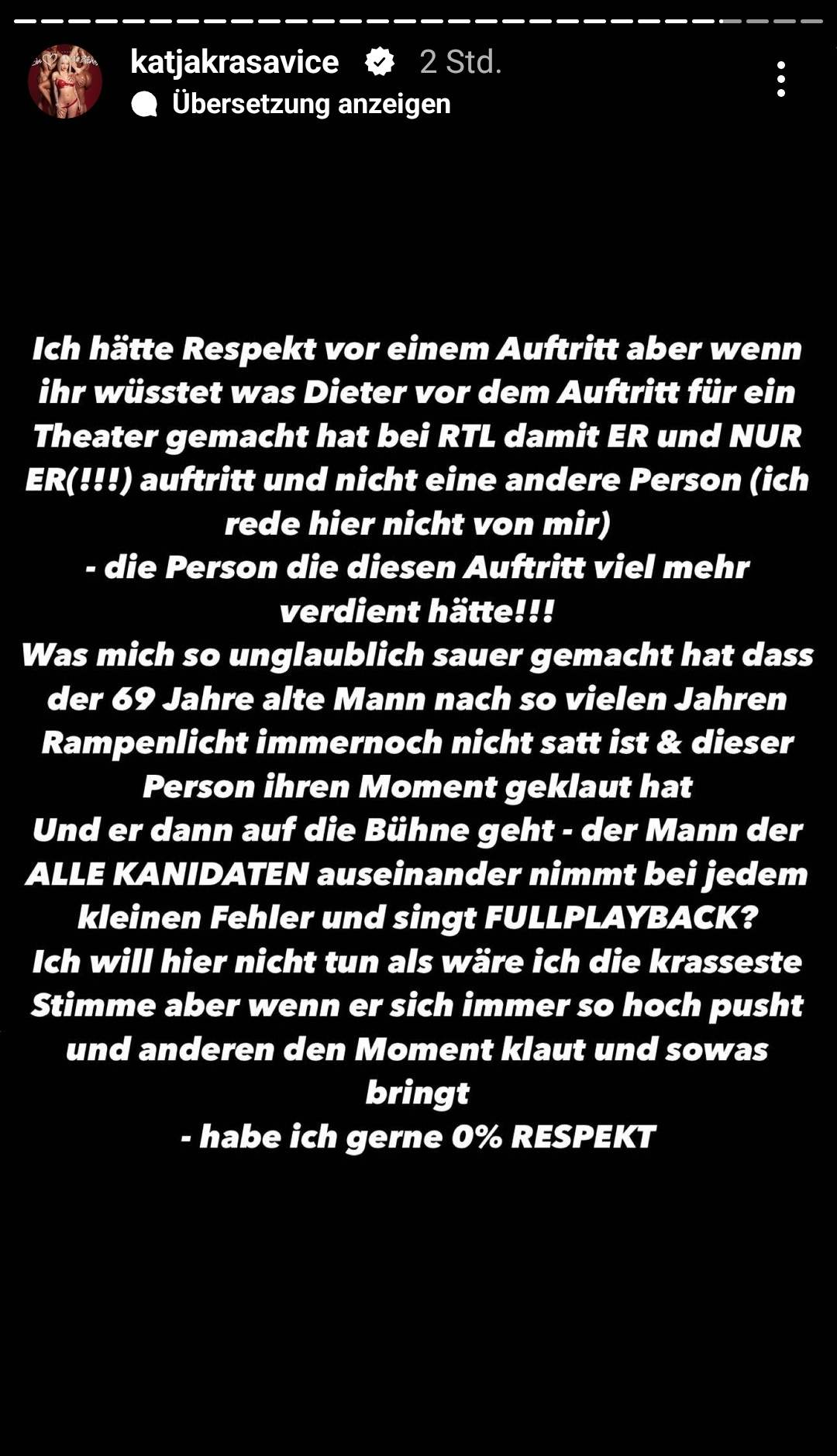 „Der Mann, der alle Kandidaten auseinander nimmt bei jedem kleinen Fehler, singt full Playback? Ich will hier nicht tun als wäre ich die krasseste Stimme aber wenn er sich immer so hoch pusht und anderen den Moment klaut und sowas bringt, habe ich gerne 0% Respekt“