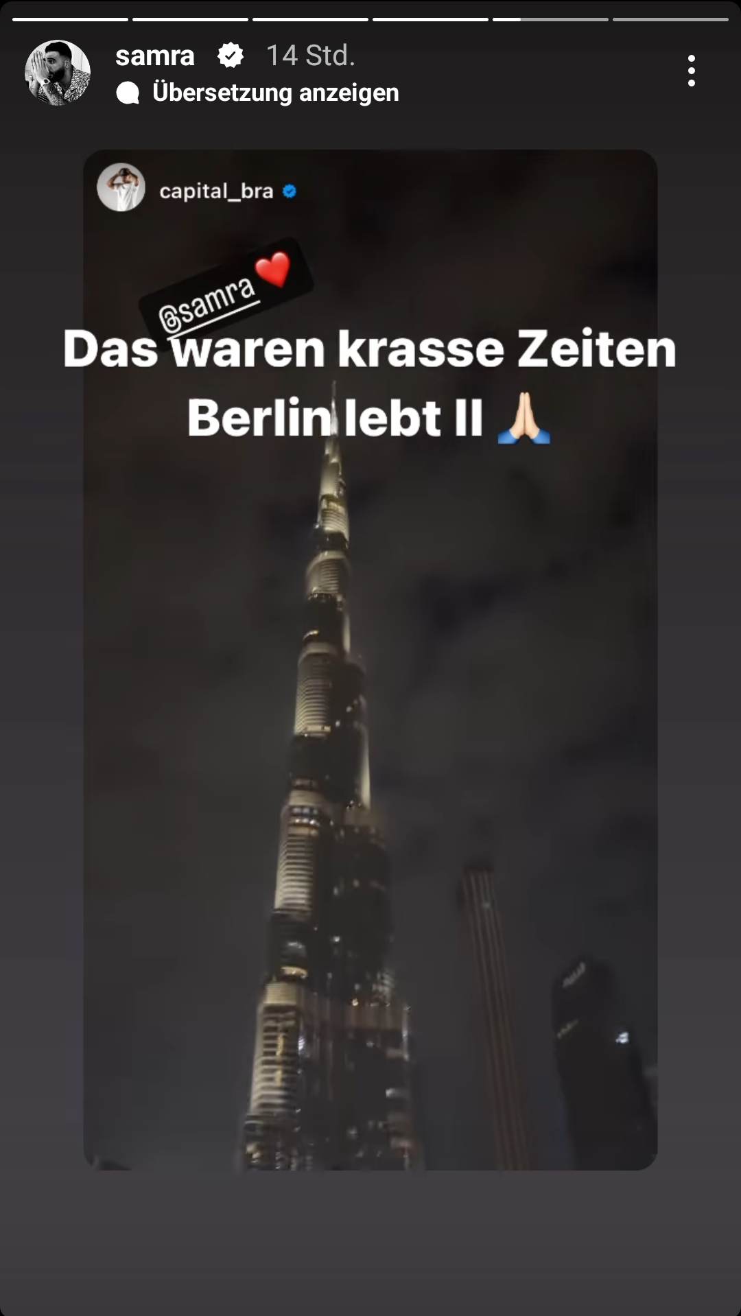In seiner Instagram-Story zeigt Capital Bra, wie er in Dubai ist und den Song „Huracan“ von dem Album „Berlin lebt 2“ pumpt.