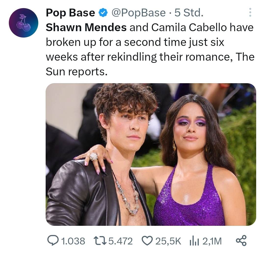Das britische Magazin „The Sun“ berichtet es zuerst: Shawn Mendes und seine langjährige Freundin Camila Cabello haben sich erneut getrennt.