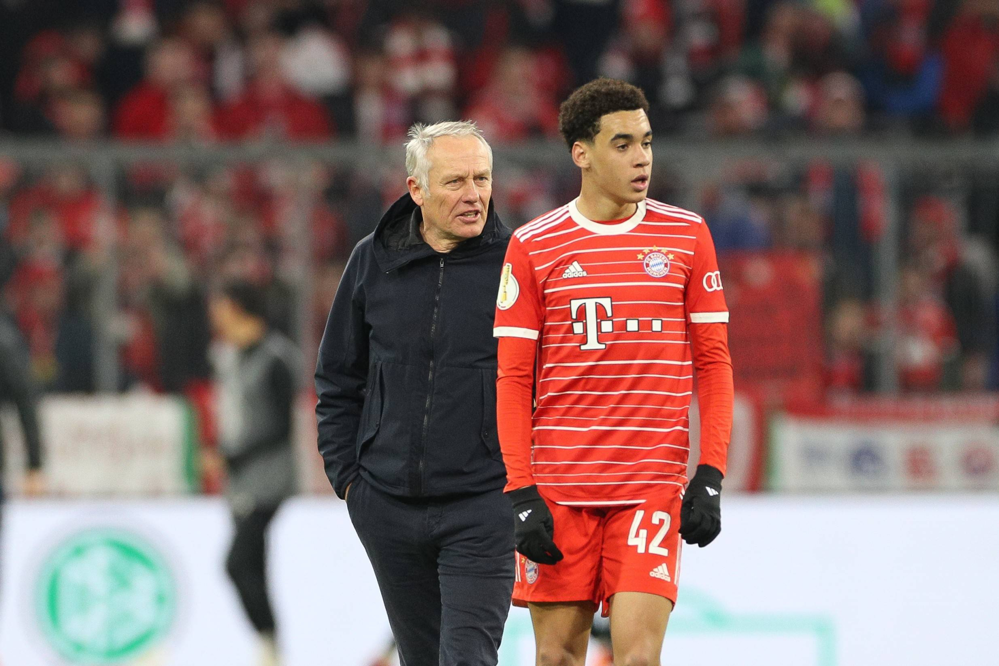 Alles gut zwischen Musiala und Streich! Sie haben nach dem Spiel miteinander geredet, Musiala hat dem Freiburger Trainer sein Trikot versprochen und wird es ihm am Samstag beim Bundesliga-Spiel geben. #FCBSCF #FCBayern @SPORT1