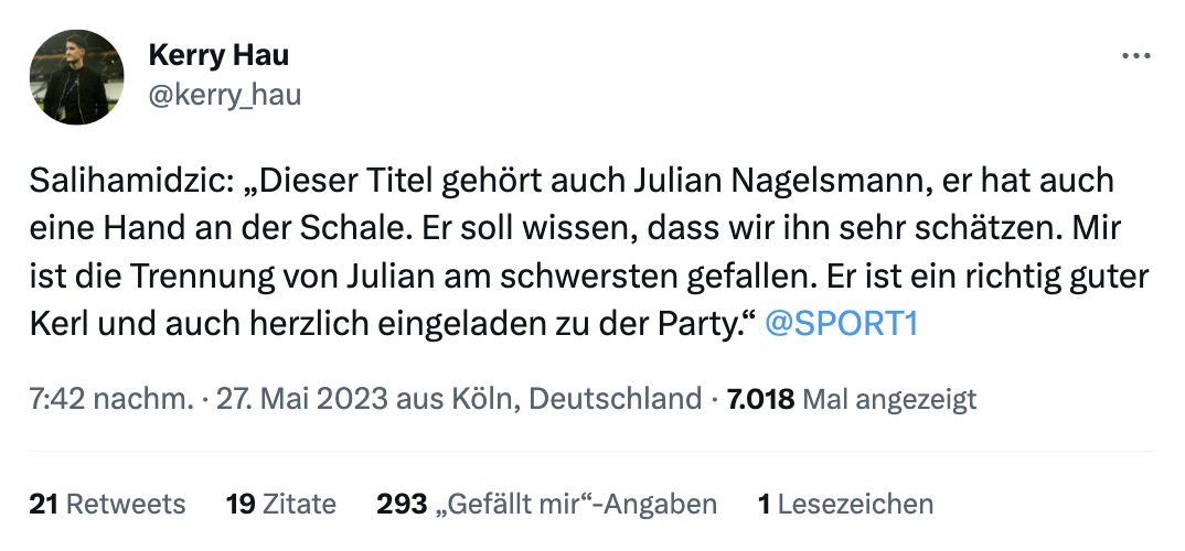 „Dieser Titel gehört auch Julian Nagelsmann, er hat auch eine Hand an der Schale. Er soll wissen, dass wir ihn sehr schätzen. Mir ist die Trennung von Julian am schwersten gefallen“