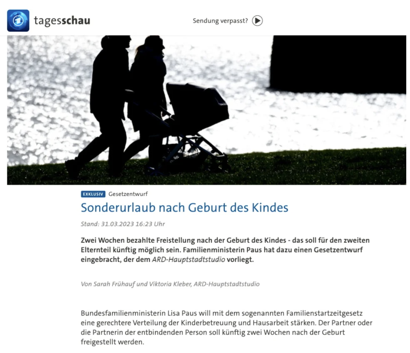 „Bundesfamilienministerin Lisa Paus will mit dem sogenannten Familienstartzeitgesetz eine gerechte Verteilung der Kinderbetreuung und Hausarbeit stärken. Der Partner oder die Partnerin der entbindenden Person soll künftig zwei Wochen nach der Geburt freigestellt werden“
