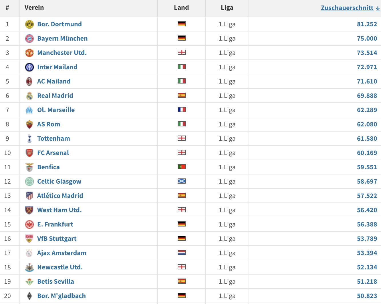 Keine andere Mannschaft kommt laut Transfermarkt auf einen so hohen Zuschauerschnitt.