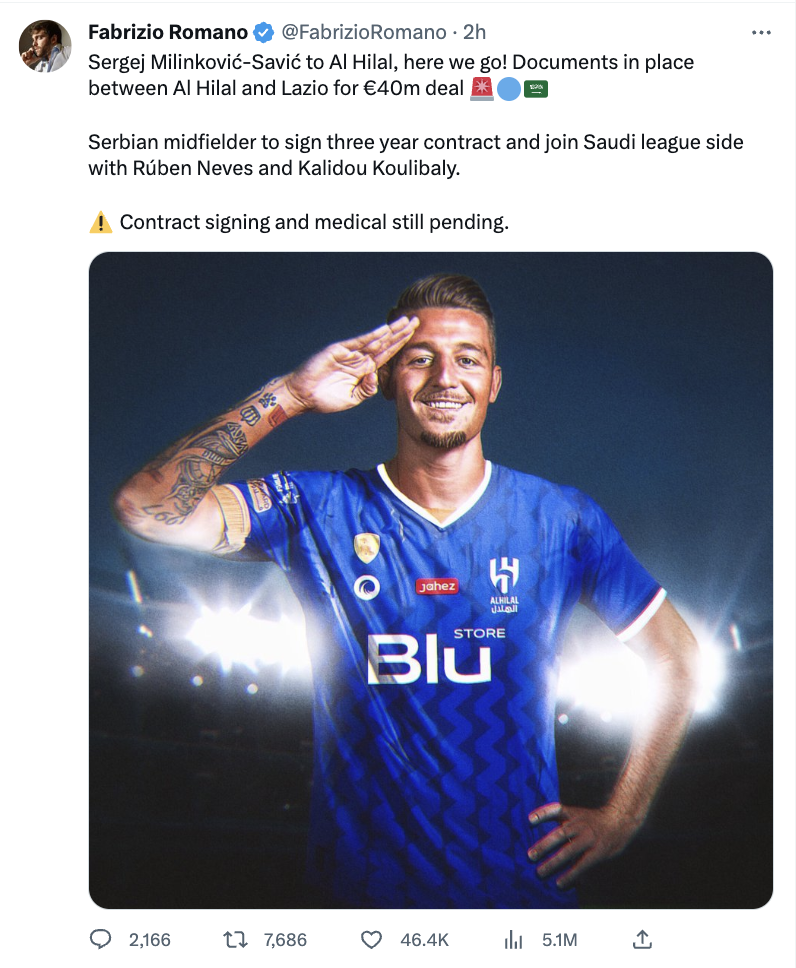 Der serbische Mittelfeldspieler unterschreibt einen Dreijahresvertrag und schließt sich der saudischen Liga an. Ab sofort kickt er mit Rúben Neves und Kalidou Koulibaly in einem Team.