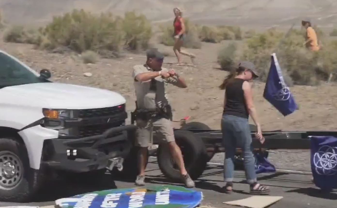 Er bedroht die Klima-Aktivisten und richtet seine Pistole auf sie.