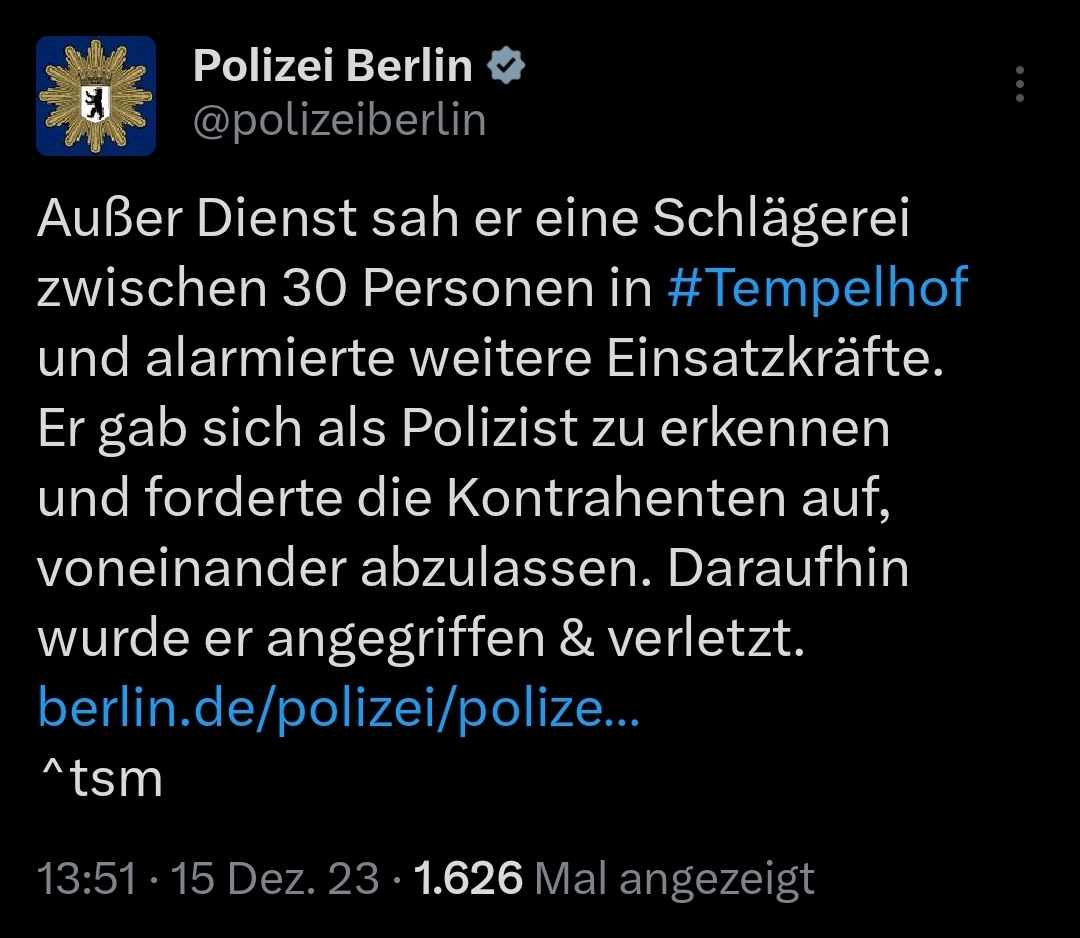 Es passiert am Donnerstagabend in Berlin: Ein Polizeibeamter außer Dienst bekommt mit, wie eine Schlägerei zwischen rund 30 Männern passiert. Als er es auflösen will, kriegt er selber Fäuste und Tritte ab…