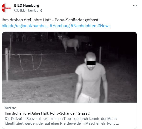 ER dringt Ende August nachts auf einen Hof ein. Kameras filmen, wie der Mann über das wehrlose Pony herfällt und es missbraucht. Nun ist er gefasst.