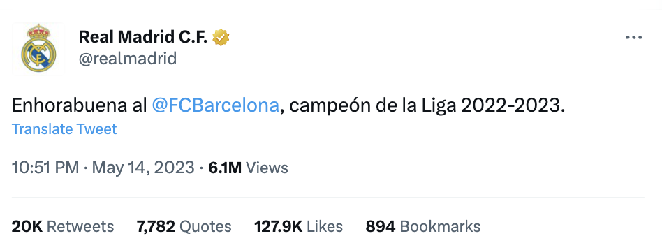 Via Twitter schickt der Cup-Sieger dem Liga-Champion eine Nachricht, in der man den Katalanen zum ersten Erfolg seit 2019 gratuliert.