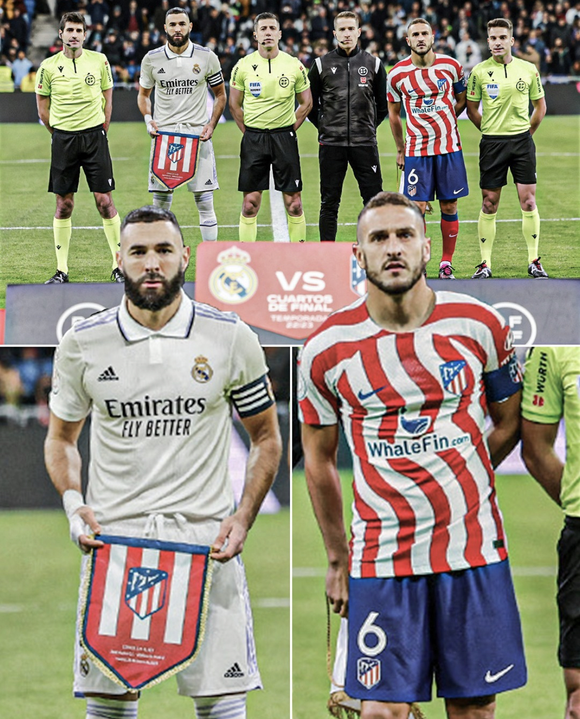 Karim Benzema nimmt den Atletico-Wimpel entgegen und hält es beim gemeinsamen Foto in die Kamera – so wie es bei jedem Spiel üblich ist. Koke hingegen versteckt den Real-Wimpel hinter sich. Krass!
