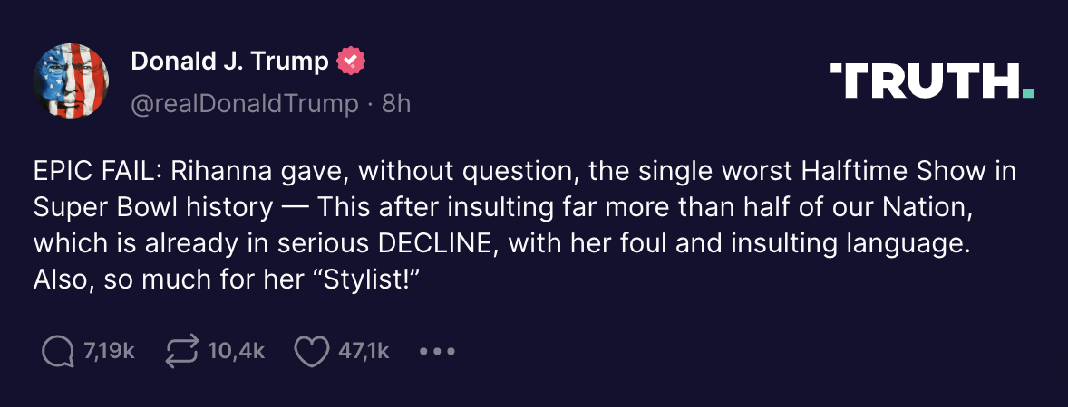 Schreibt er jetzt auf seinem eigenen Social Network. Rihanna trat am Sonntag beim Superbowl auf.