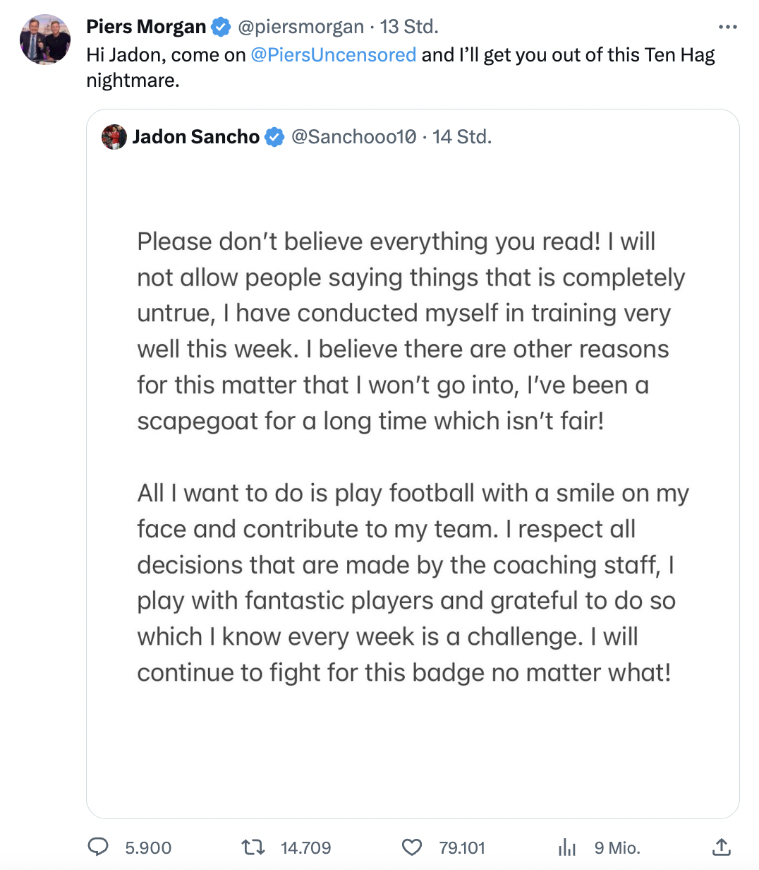Das antwortet Piers auf die Message von Jadon Sancho, die der am Sonntag Abend rausschickt.
