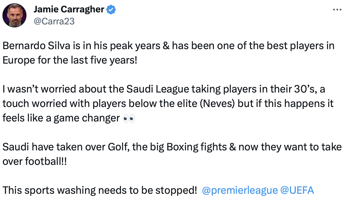 Der Wüstenstaat ködert große Superstars mit irren Geldsummen. Und große Fußballexperten schlagen Alarm und sind in großer Sorge um Europas Spitzenfußball. Nach Gary Neville meldet sich auch Jamie Carragher.