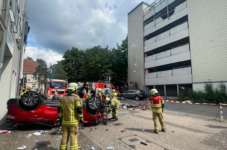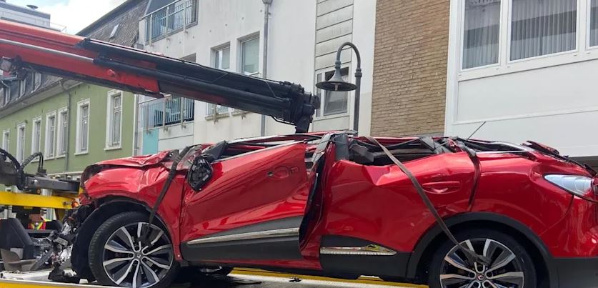 So stark, dass sie beschleunigt und dabei durch eine Brüstung zehn Meter in die Tiefe kracht. Vier Etagen fällt ihr Renault Kadjar aus dem Parkhaus.