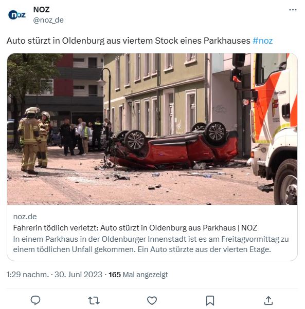 Parkhaus-Albtraum im niedersächsischen Oldenburg. Eine Senioren will in eine Parklücke einparken, doch dabei tritt sie voll aufs Gas und stürzt in den Tod.