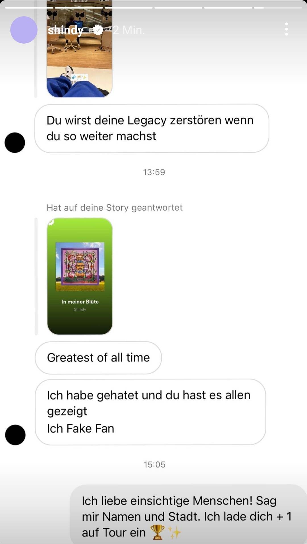 In seiner Instagram-Story zeigt Shindy einen Chat von einem User, welcher zuerst ein Hater war.
