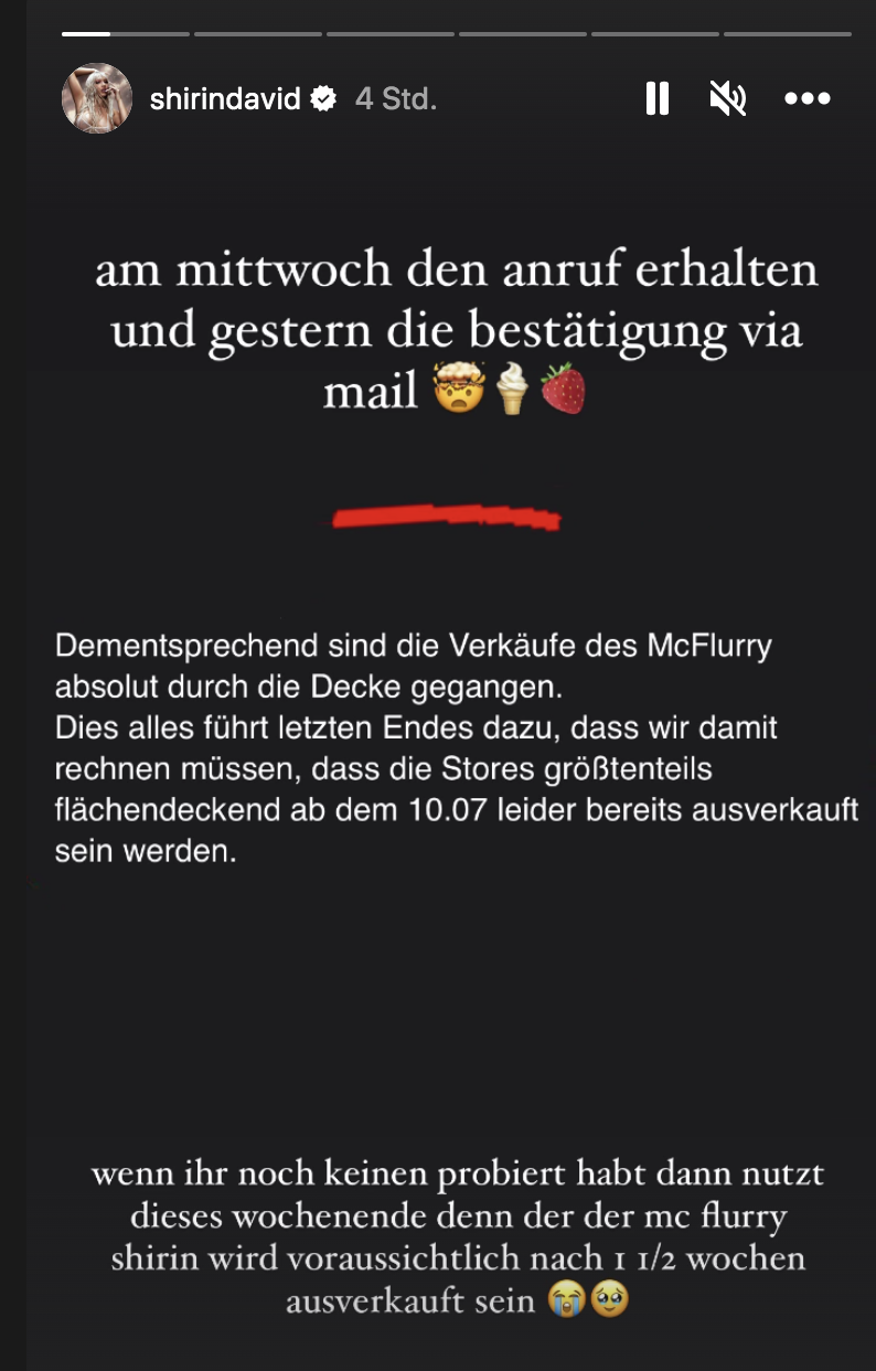 „Nur für kurze Zeit“. Das kündigte McDonald’s schon zum Start des McFlurry von Superstar Shirin David an. Doch diese Zeit ist jetzt noch kürzer geworden – fast ausverkauft!