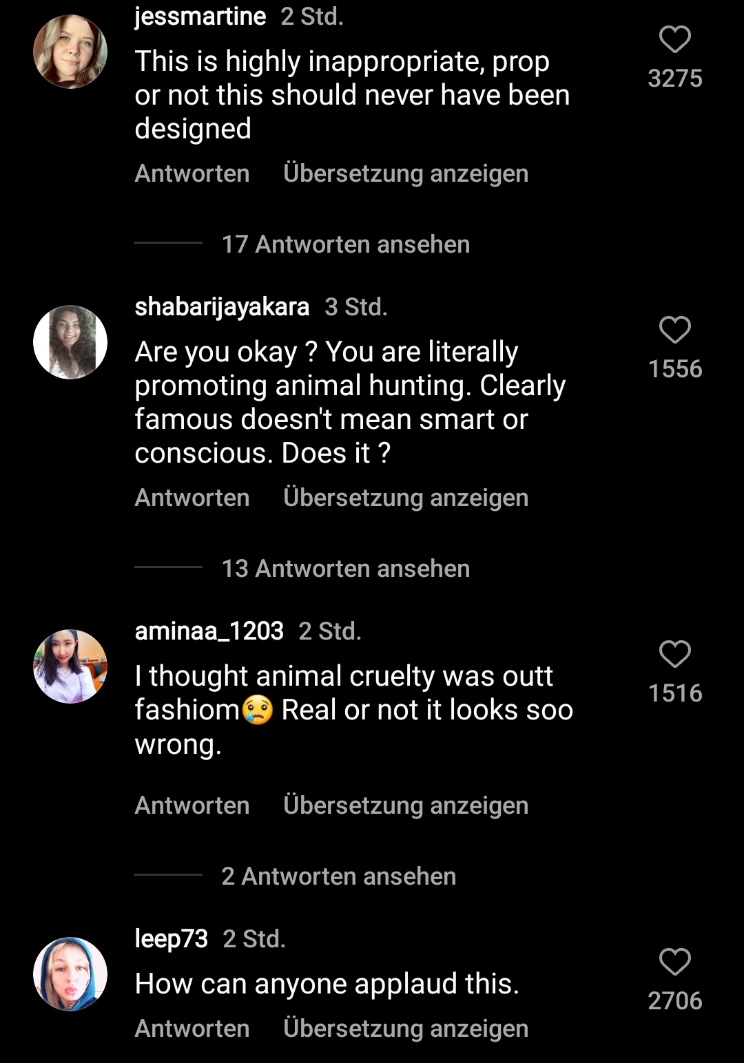 Unter dem Post findet man hunderte Kommentare mit tausenden von Likes, die Kylies Outfit einfach daneben finden. Einige User finden sogar, dass so ein Look Tierquälerei und das Jagen von Löwen fordert…