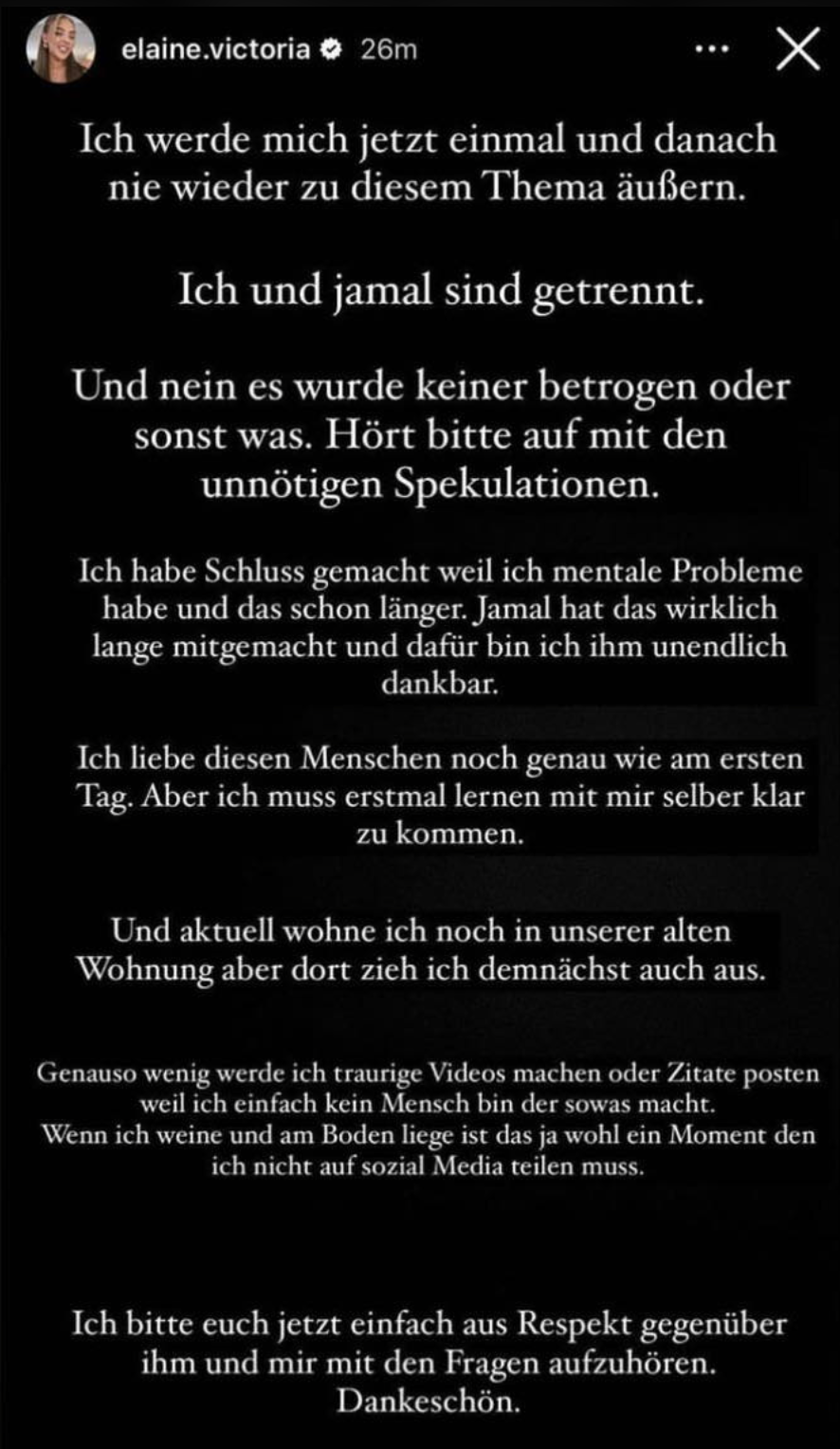 „Ich werde mich jetzt einmal und danach nie wieder zu diesem Thema äußern. Ich und Jamal sind getrennt. Und nein es wurde keiner betrogen oder sonst was. Hört bitte auf mit den unnötigen Spekulationen“