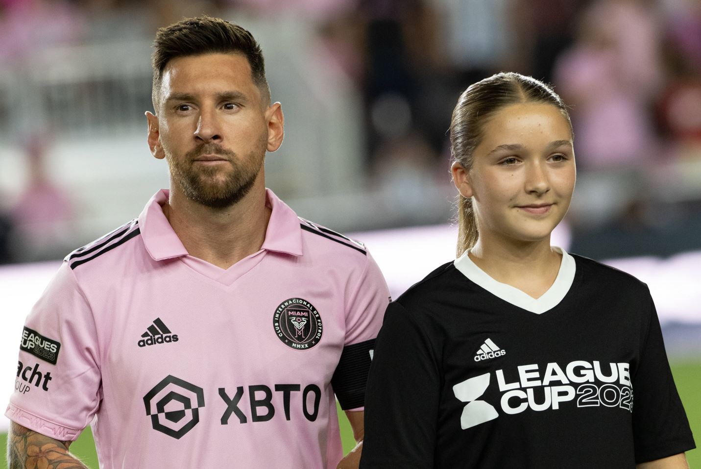 In der Partie gegen Fort Lauderdale darf Harper Seven, die Tochter von Klub-Eigentümer David Beckham an der Hand des Weltstars auf den Rasen laufen.