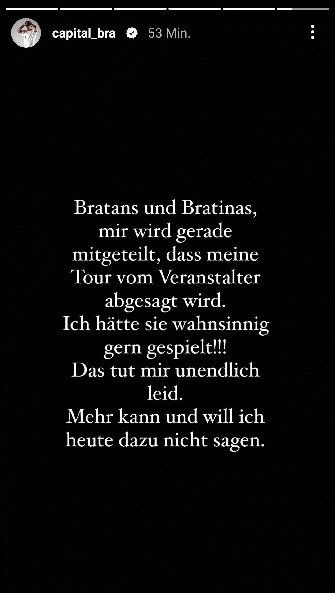 In seiner Instagram-Story gibt der Bratan bekannt, dass seine gesamte Tour vom Veranstalter abgesagt wurde.
