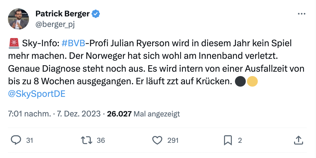 Laut SKY geht man beim BVB von einer Ausfallzeit von mindestens 2 Monaten aus.