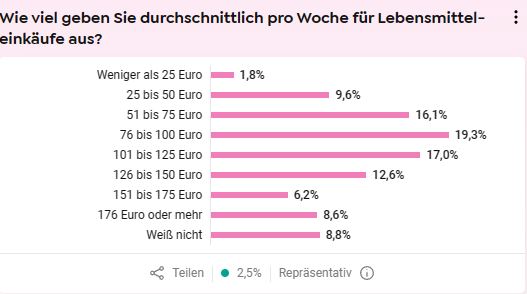 Mit weniger als 25 Euro kommen in der Woche 1,8 Prozent der Befragten aus. 8,6 Prozent liegen bei 175 Euro oder mehr.