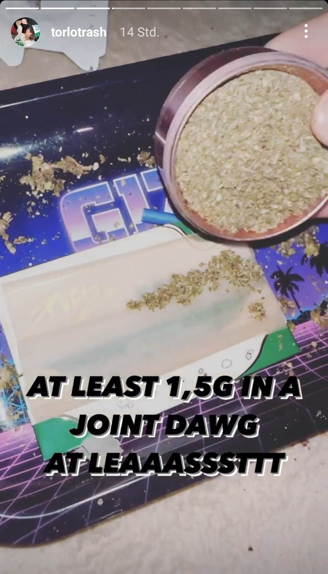 In seiner Instagram-Story zeigt T-Low seinen Joint und schreibt dazu, dass er mindestens 1,5 Gramm pro Stück benutzt.