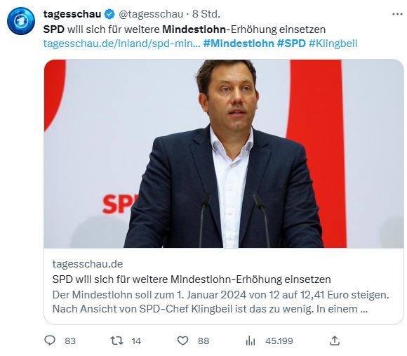 Im kommenden Jahr wird der Mindestlohn von derzeit zwölf auf dann 12,41 Euro steigen. Für Klingbeil ist das viel zu wenig: