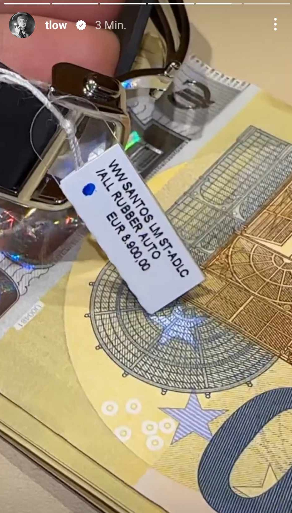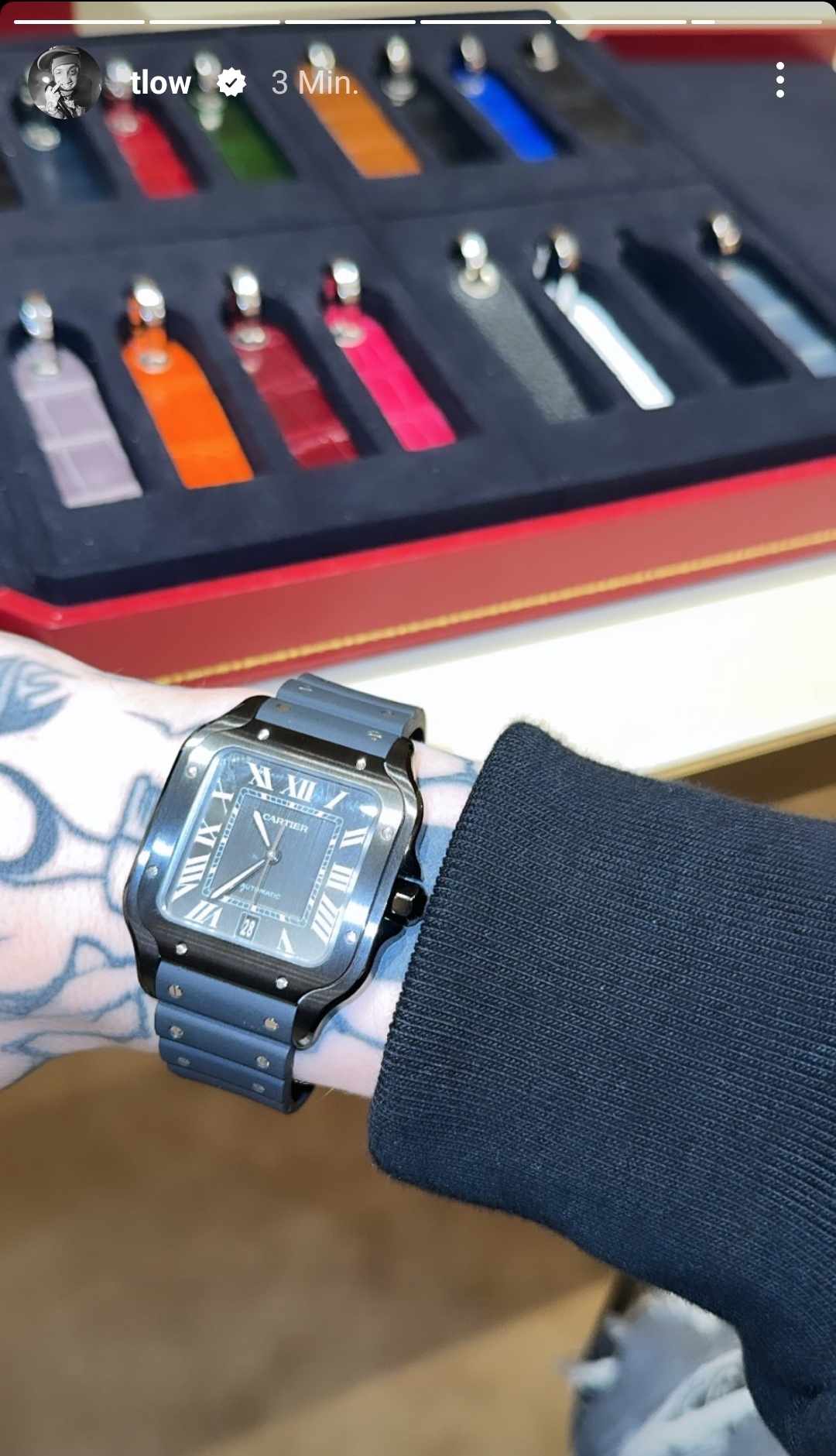 In seiner Instagram-Story präsentiert T-Low seine neue Cartier Santos in Schwarz.