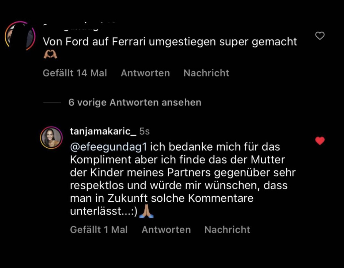 „Ich bedanke mich für das Kompliment, aber ich finde das der Mutter der Kinder meines Partners gegenüber sehr respektlos und würde mir wünschen, dass man in Zukunft solche Kommentare unterlässt“