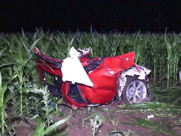 Beim Zusammenprall mit dem Baum reißt das Heck samt Achse ab und wird in ein hunderte Meter entferntes Maisfeld geschleudert.