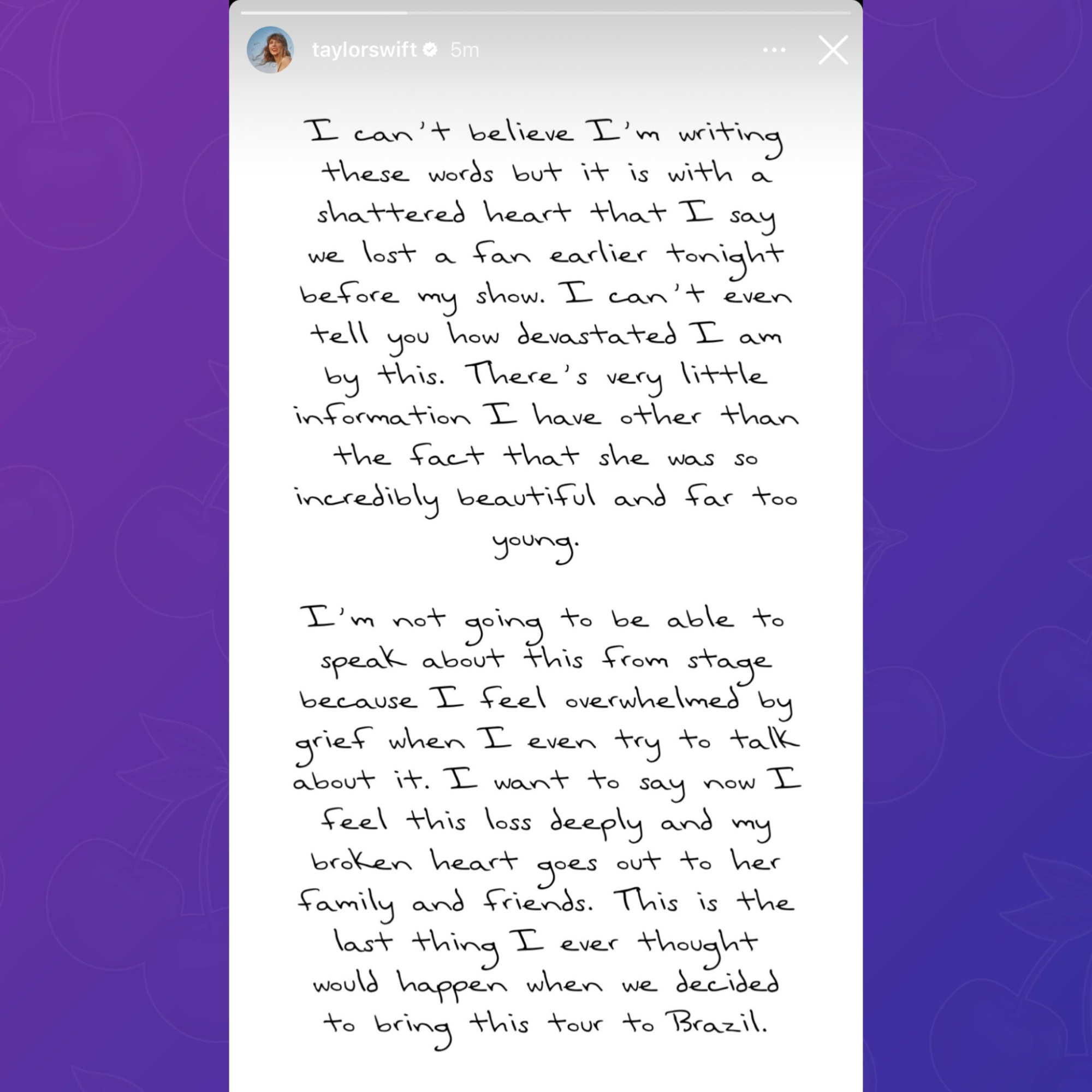„Ich kann nicht glauben, dass ich diese Worte schreibe, aber ich muss mit gebrochenem Herzen sagen, dass wir heute Abend vor meiner Show einen Fan verloren haben.