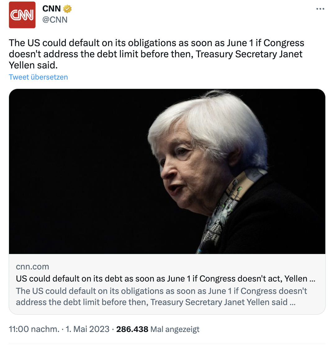 Janet Yellen warnt jetzt in einem Brief vor einem Zahlungs-Ausfall der USA.
