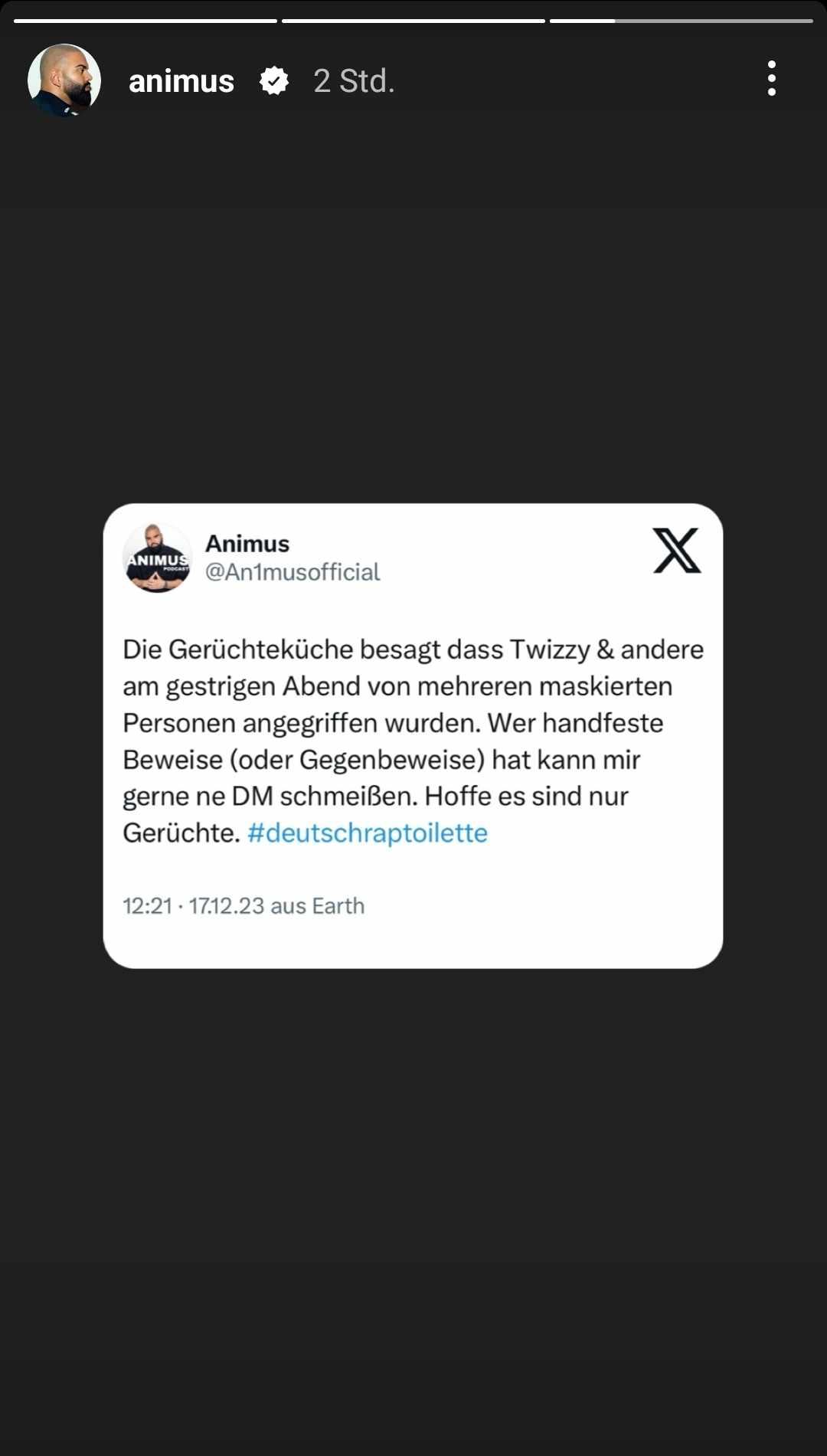 „Die Gerüchteküche besagt, dass Twizzy & Andere am gestrigen Abend von mehreren maskierten Personen angegriffen wurden (…) Hoffe es sind nur Gerüchte“